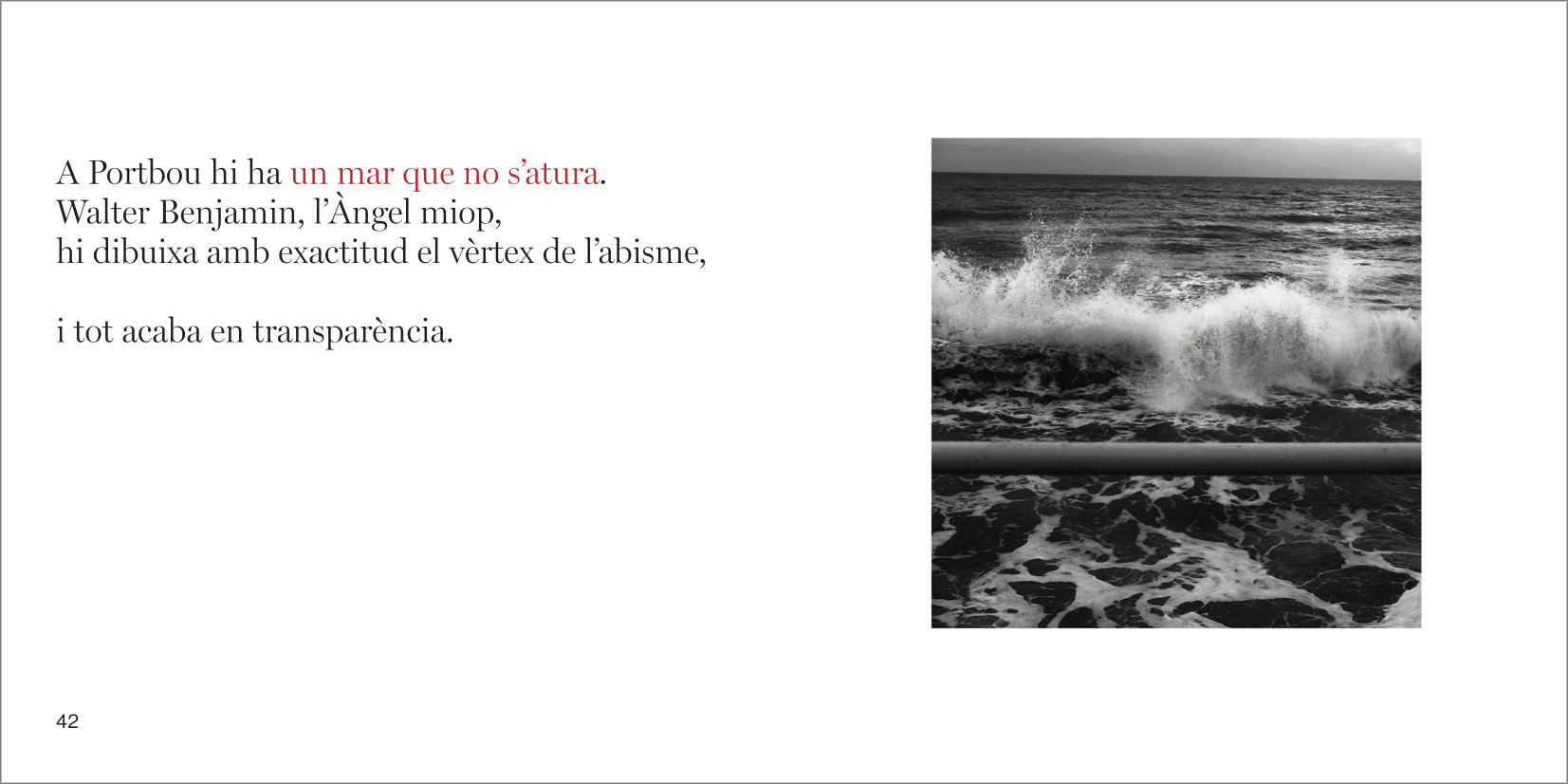 El discurs central del llibre sencer és un preciós i intrigant camí en paral·lel amb punts d'intersecció entre les fotografíes genials de Manel Esclusa i els poemes genials de Jordi Carrió. Un dialeg des de la bilateralitat més escrupulosa, un veritable acostament sense muntatge, sense preconcepcions entre dos projectes vitals i artístics agermanats.