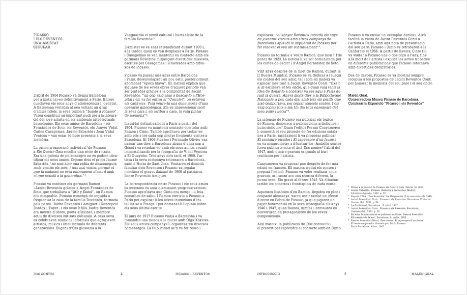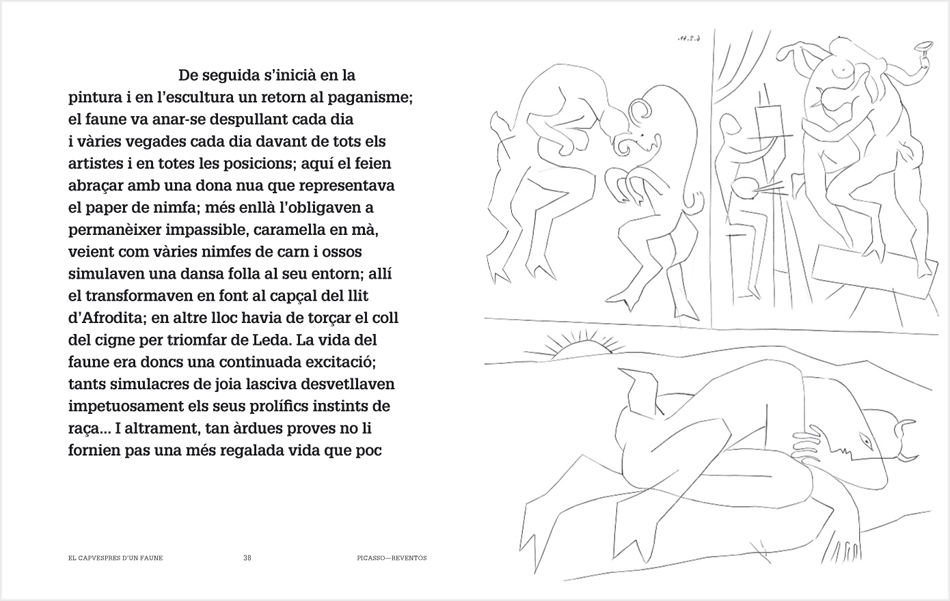 Picasso ja exiliat a París, va conèixer a Ferran Canyameres i el seu projecte editorial, editar llibres catalans a França, i li va proposar publicar l'obra del seu amic il·lustrada per ell, Picasso. Fruit d'aquesta idea va néixer la publicació Dos contes, "El centaure Picador i El capvespre d'1 faune", el primer llibre il·lustrat per Picasso en una llengua diferent al francès, el pintor va fer quatre gravats al burí, que es mostren en l'exposició, al febrer de 1947.