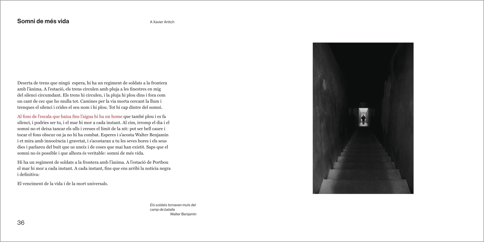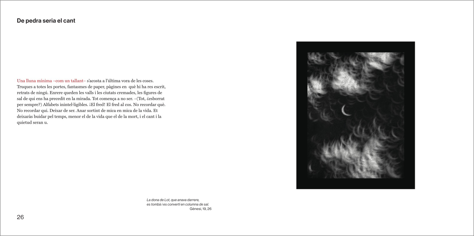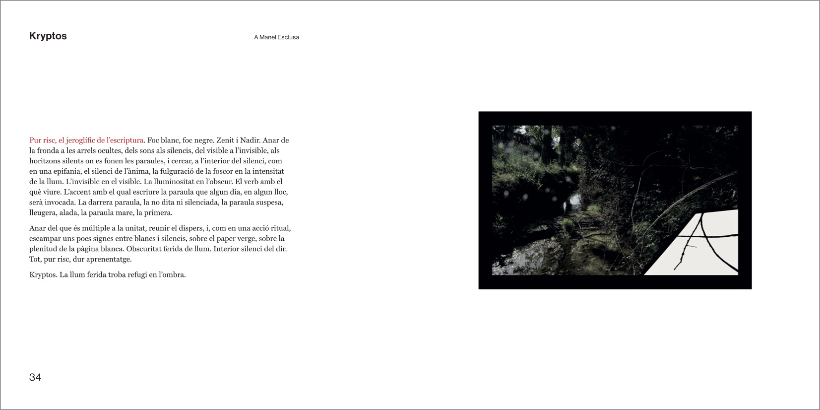El discurs central del llibre sencer és un preciós i intrigant camí en paral·lel amb punts d'intersecció entre les fotografíes genials de Manel Esclusa i els poemes genials de Jordi Carrió. Un dialeg des de la bilateralitat més escrupulosa, un veritable acostament sense muntatge, sense preconcepcions entre dos projectes vitals i artístics agermanats.
