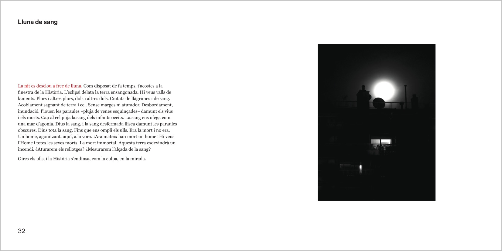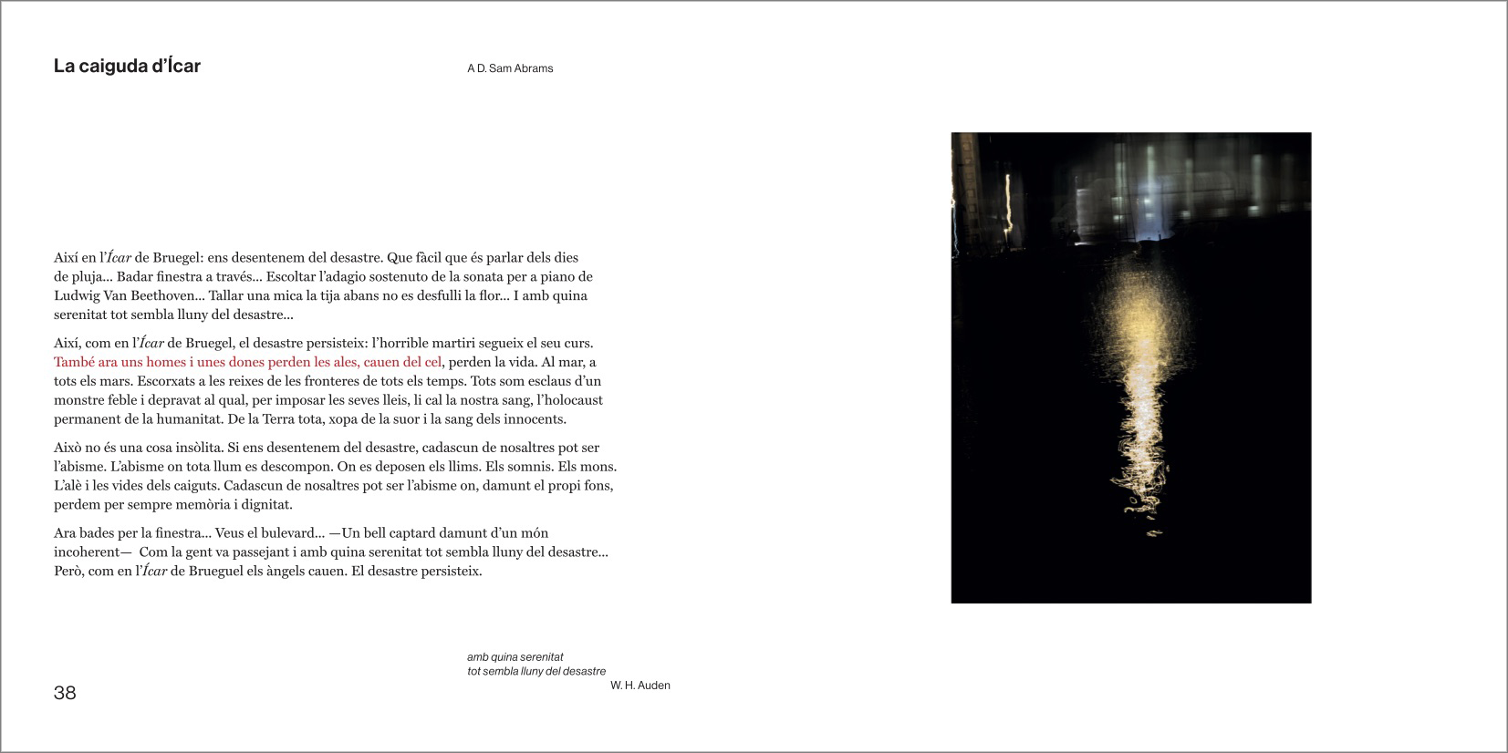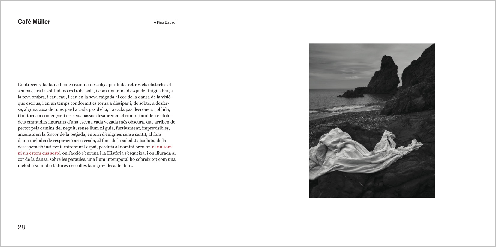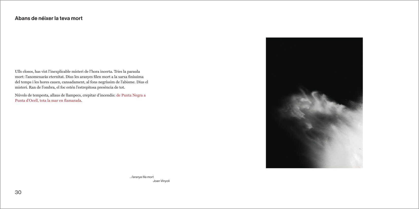 El discurs central del llibre sencer és un preciós i intrigant camí en paral·lel amb punts d'intersecció entre les fotografíes genials de Manel Esclusa i els poemes genials de Jordi Carrió. Un dialeg des de la bilateralitat més escrupulosa, un veritable acostament sense muntatge, sense preconcepcions entre dos projectes vitals i artístics agermanats.