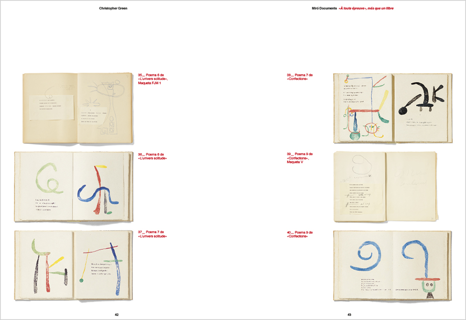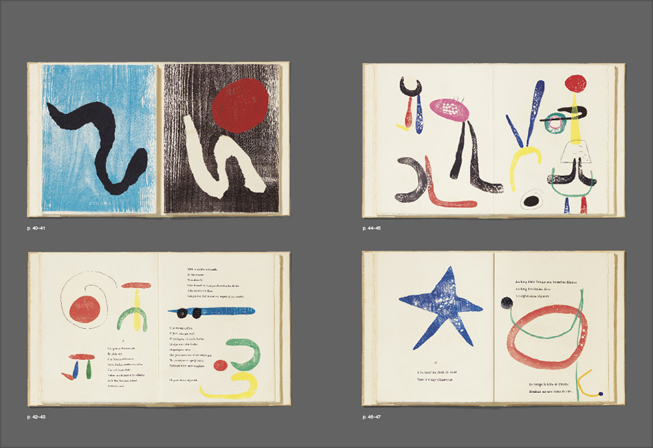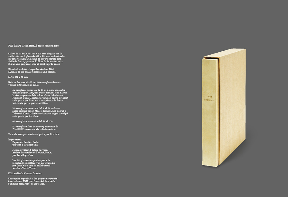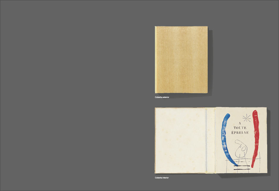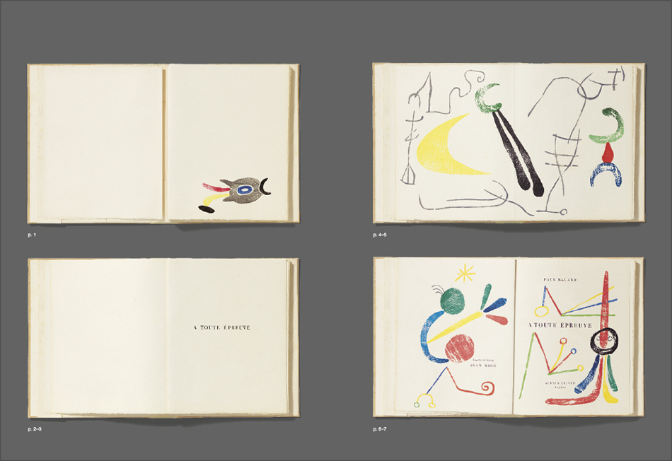 À toute épreuve’, more than a book presents a six-handed adventure in the making of an artist’s book. The painter Joan Miró, the editor Gérald Cramer and the poet Paul Éluard, who died before the book was published, worked in close collaboration over a ten-year period with the idea of creating a book-object in which poems and images would shape every page in such a way that, to quote the exhibition’s curator Christopher Green, the user would ‘experience’ the book.