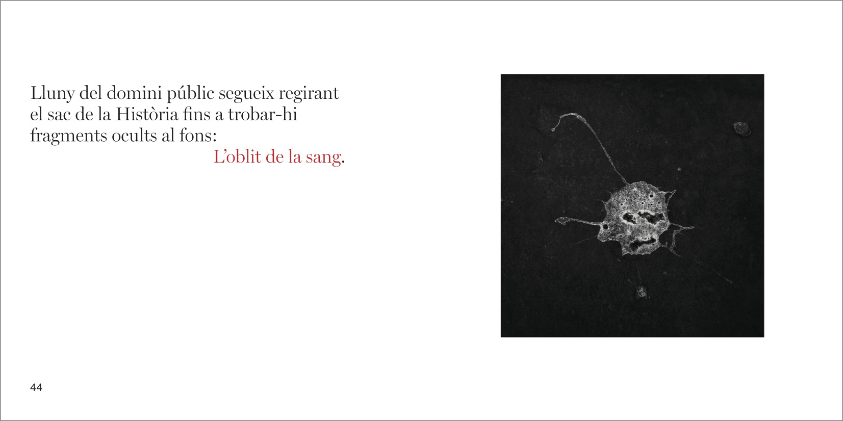 El discurs central del llibre sencer és un preciós i intrigant camí en paral·lel amb punts d'intersecció entre les fotografíes genials de Manel Esclusa i els poemes genials de Jordi Carrió. Un dialeg des de la bilateralitat més escrupulosa, un veritable acostament sense muntatge, sense preconcepcions entre dos projectes vitals i artístics agermanats.